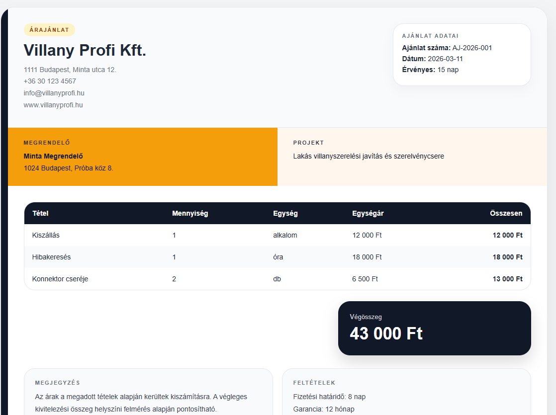 számára. Add meg a munkatételeket, a mennyiségeket és az árakat, majd